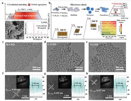 如图2所示,传统高温退火法生成的LaNiO3颗粒团聚,而微波热冲法则成功合成了六方、三角和立方相的二维多孔结构,并通过SEM和HRTEM图像确认了这些材料结构的一致性。