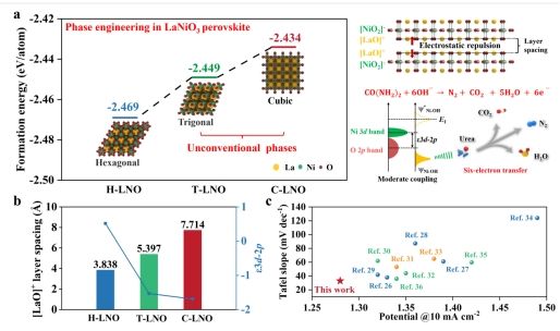 此研究利用非平衡的微波热冲法在二维LaNiO3中实现了传统六方晶相与非常规相(立方晶相、三角晶相)的相变调控,同时还利用快速淬火形式保持了材料的二维多孔结构。结果表明,立方相LaNiO3凭借其优越的结构对称性和较大的层间距,显著提高了电子迁移效率和活性位点的可达性,展现出优异的尿素氧化反应(UOR)性能。此研究首次展示了LaNiO3通过非常规相的引入和调控,优化Ni 3d与O 2p轨道杂化及局部电荷分布,从而有效提升六电子转移过程的催化性能。这一发现不仅突显了微波热冲法在二维材料相变调控中的独特优势,也为理解相变对电催化机制的影响提供了新的见解。