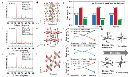 如图3所示,XRD及其Rietveld精修的全面解析展示了不同晶相中Ni-O键长和键角的显著变化,表明相变引发了结构重构和电子态变化。尤其是,Jahn-Teller效应导致的NiO6八面体畸变和局部电子状态的变化,显著影响了材料的结构稳定性。